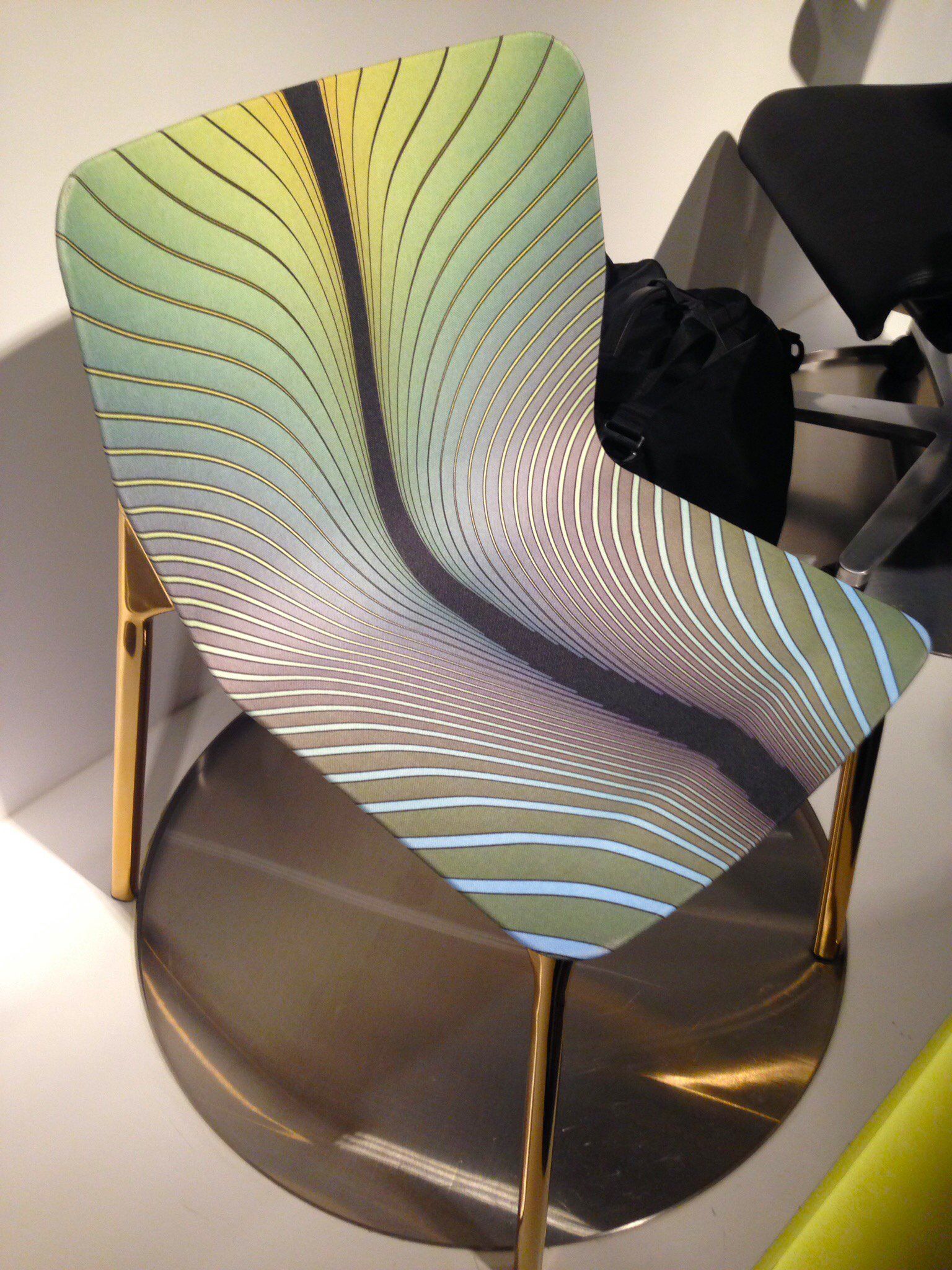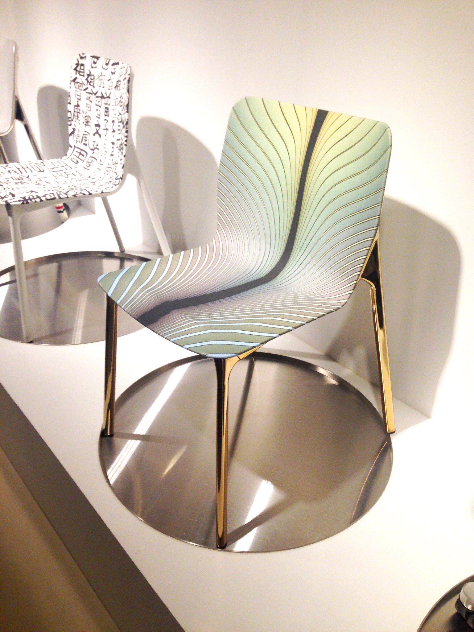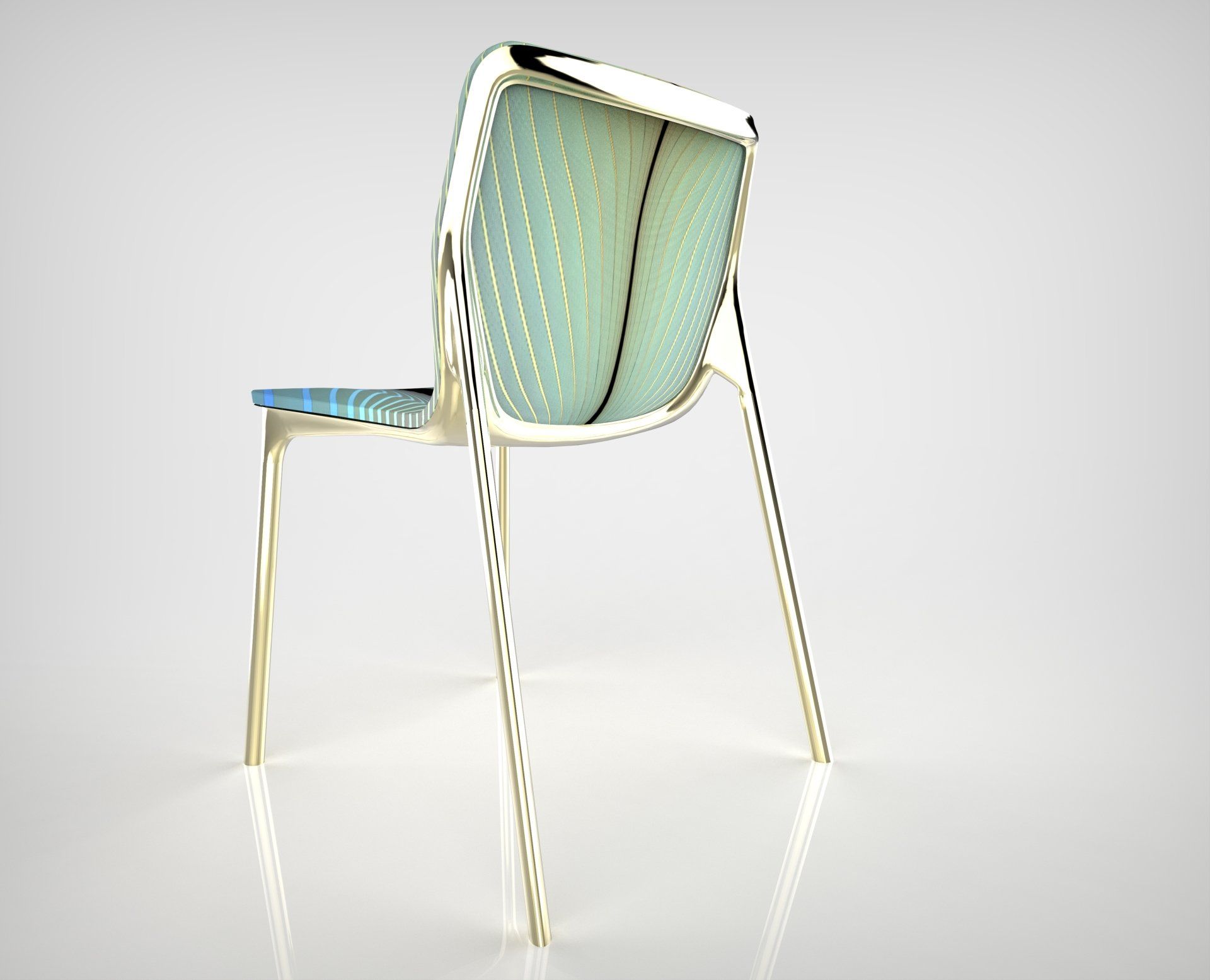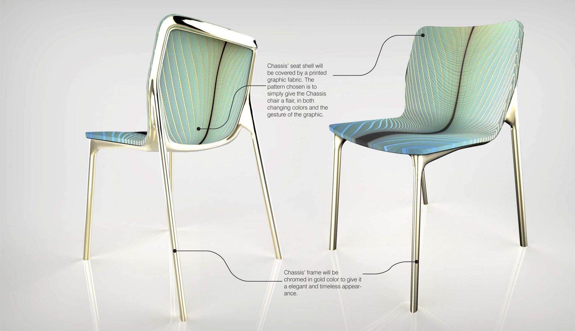 half AND half participated in their competition on “rethinking” the Chassis; the idea is to use a printed graphic that simply gives the Chassis a “FLAIR”; by placing a continuously changing pattern, gesture and color of the graphic, and chroming the frame in a gold color results in a new appearance of the Chassis that is elegant and timelessness that brings balance to the industrial processes that is used to fabricate the chair.