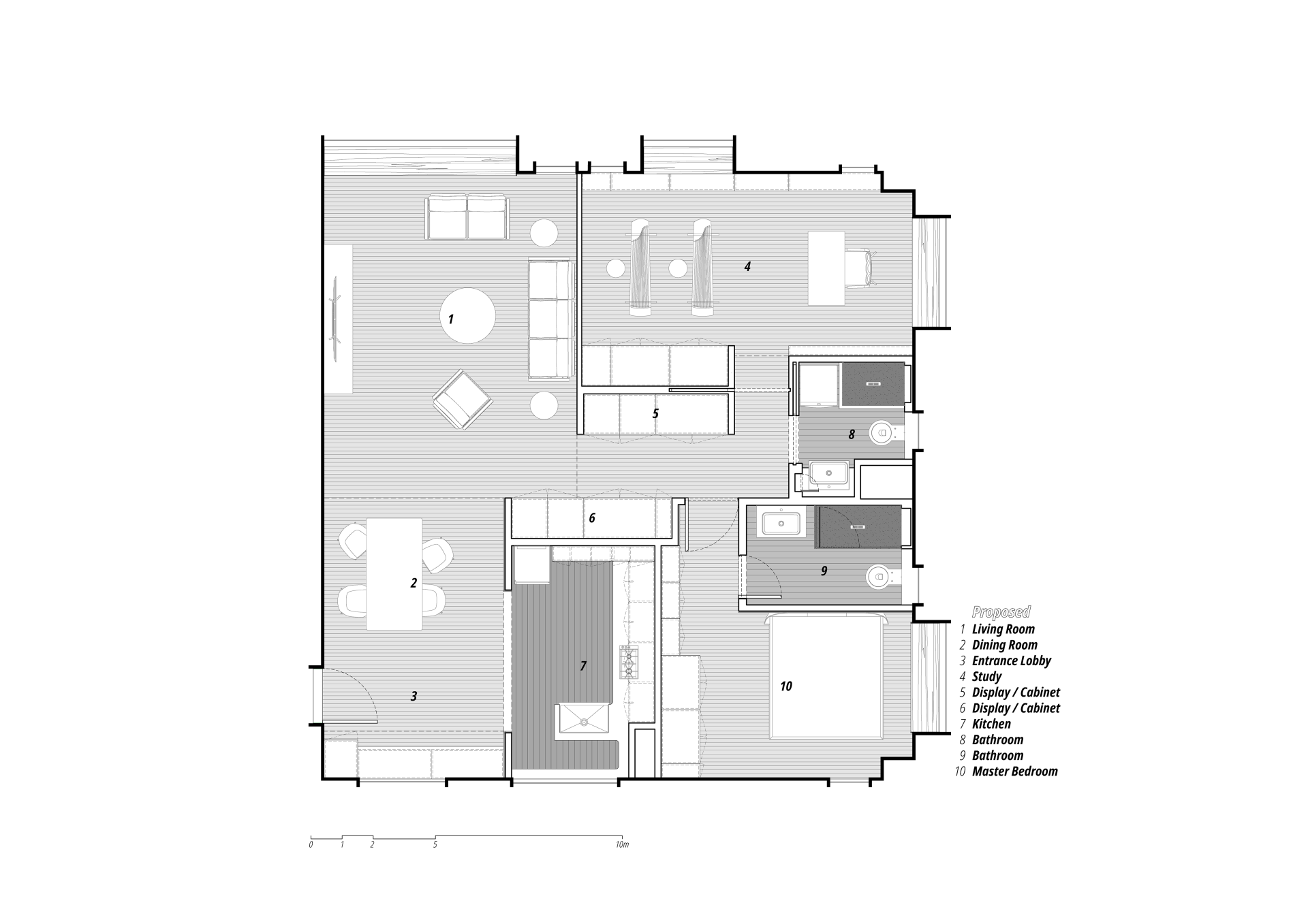As an existing 3-bedroom apartment, it was decided to expand the study and eliminate one of the bedrooms, this allows for abundance of spaces for the practicing and teaching of Guzheng without disturbing the other areas of the apartment.