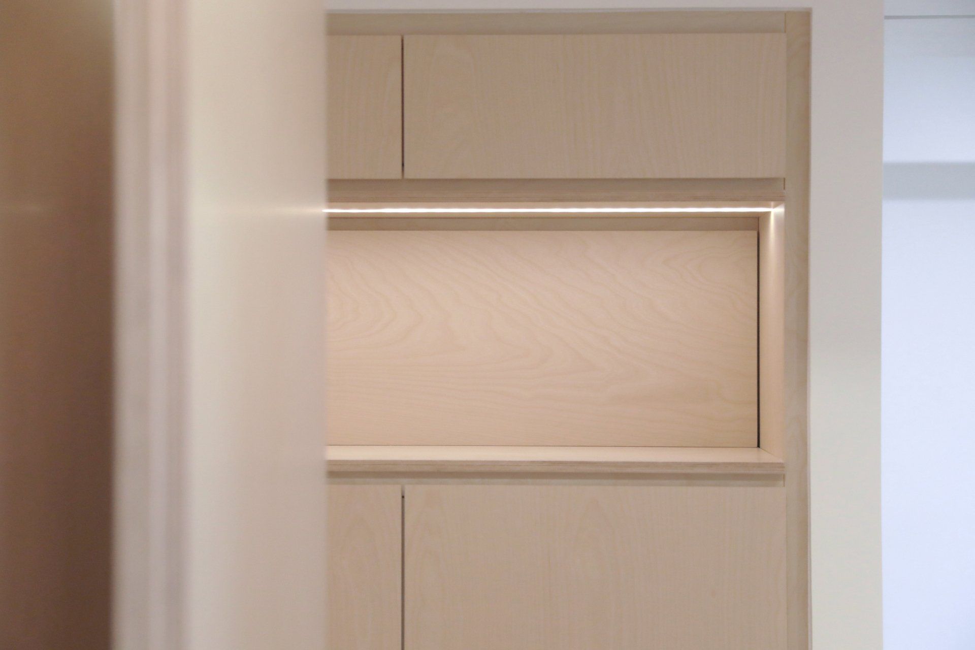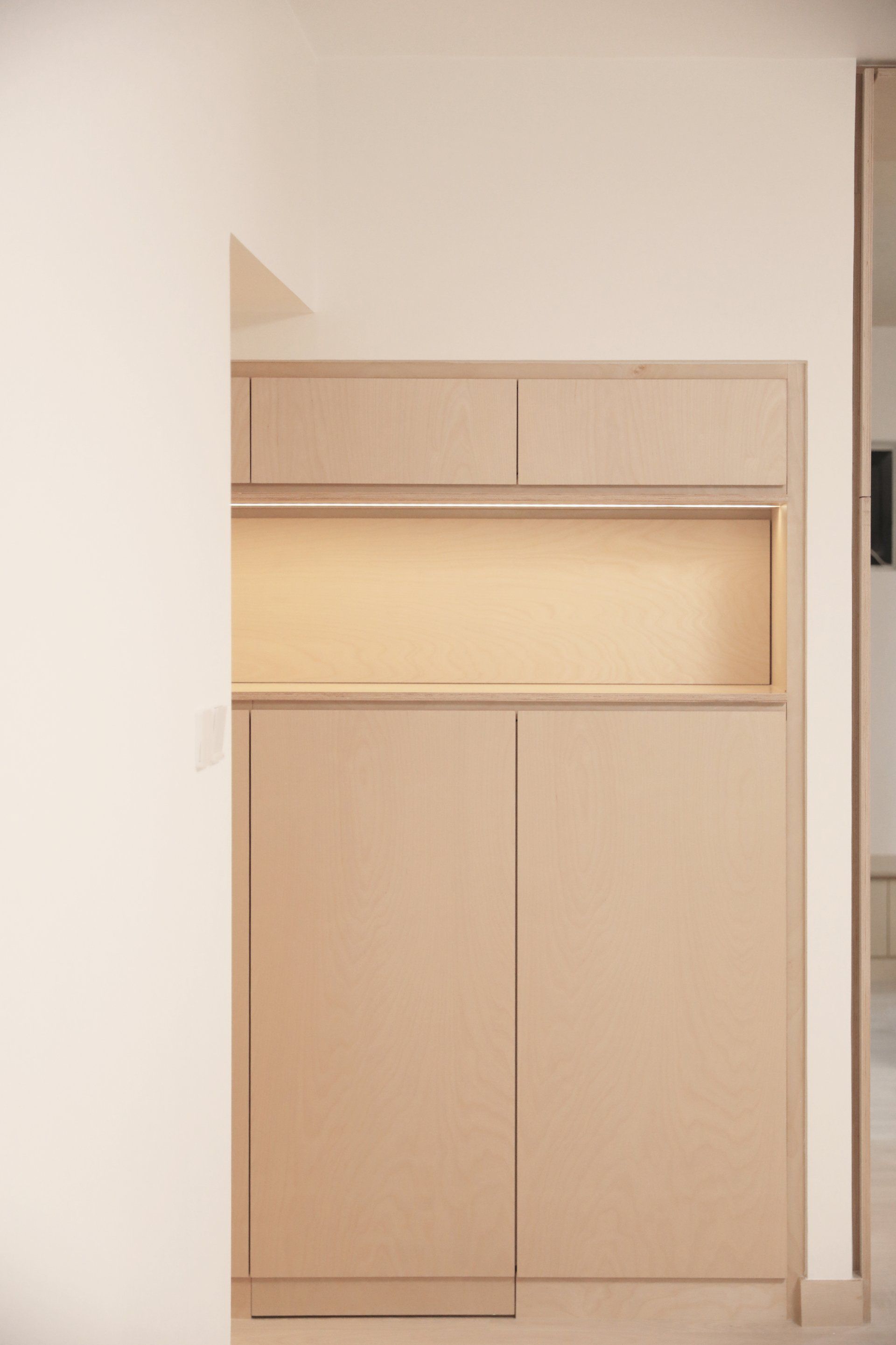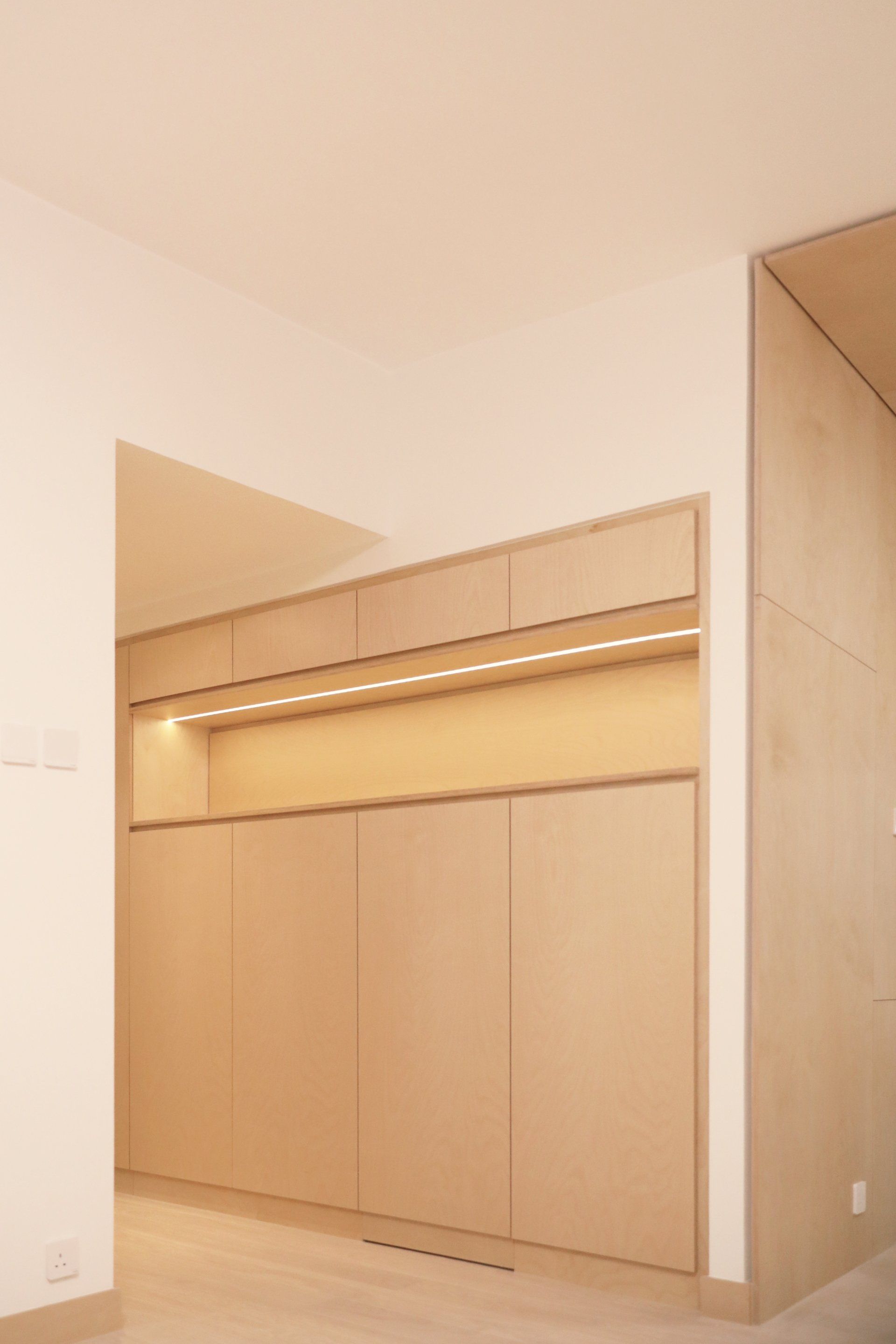 The primary material chosen was Birch-Veneered Plywood; as it gives the versatility in strength, stability and elegance. This was not only used for the shelving units, but also, as a decorative and functional finish on selected spaces; fully exposing the beautiful materiality of the layering and lamination that is artificially natural for plywood.