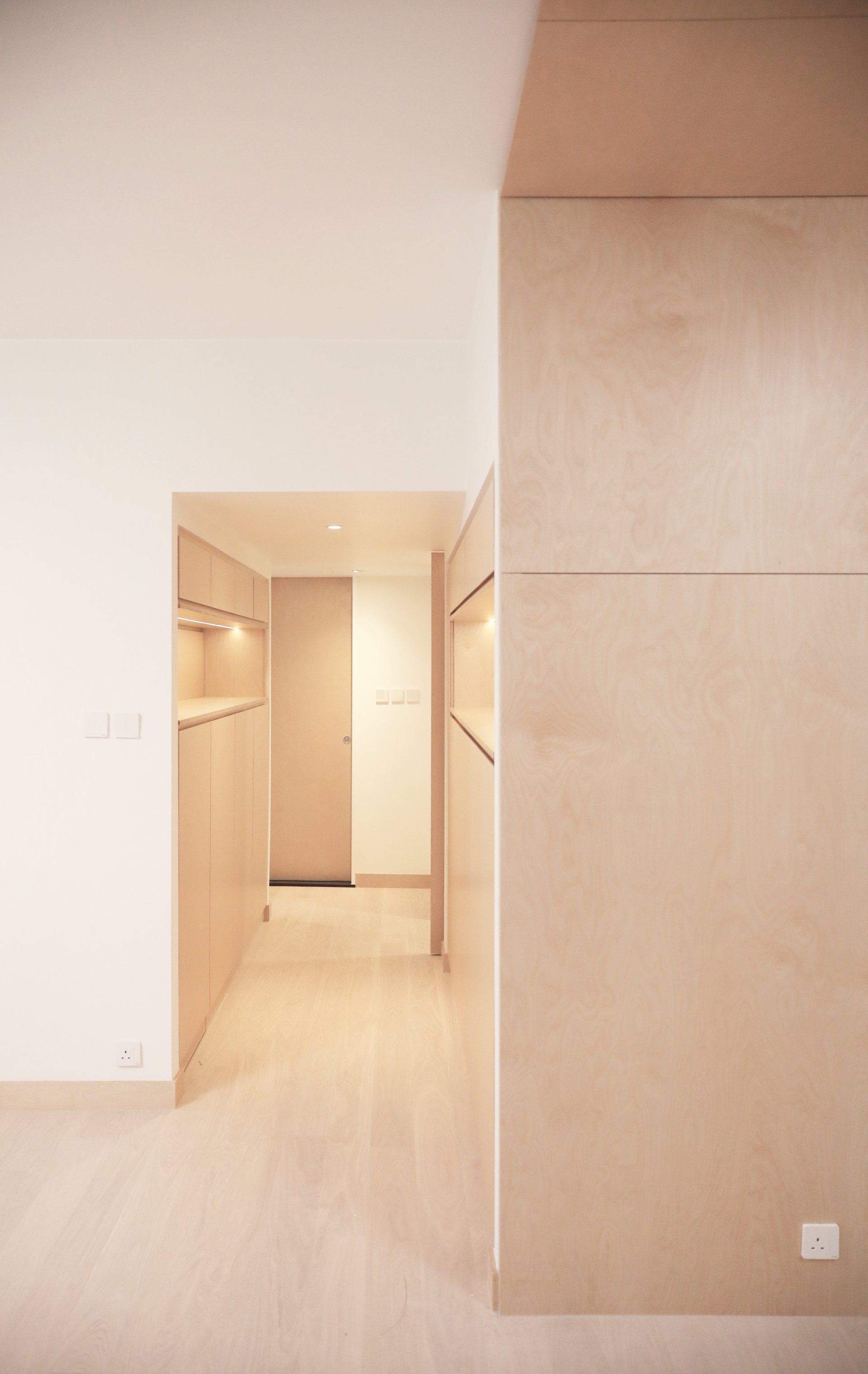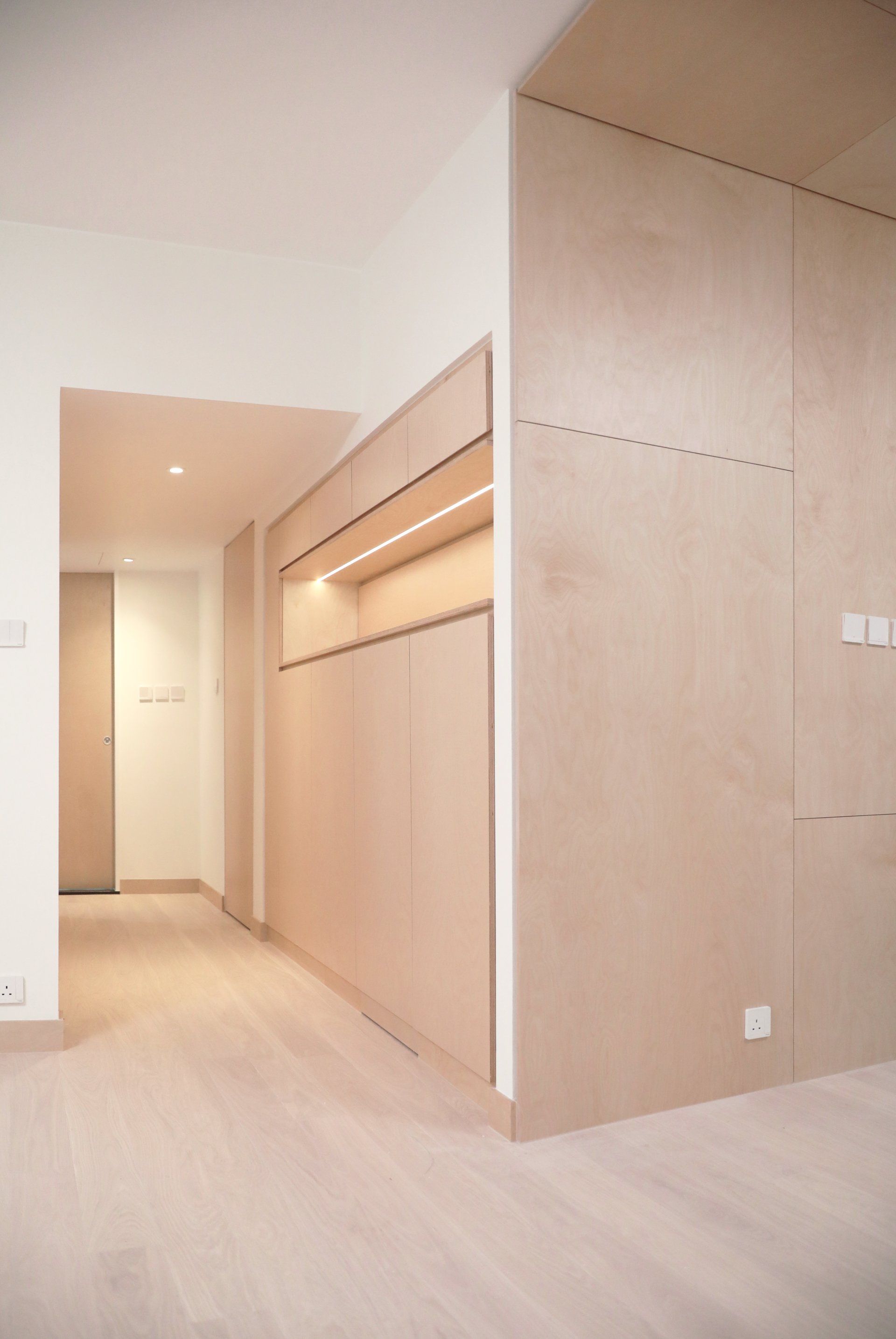 The corridor that links up between the public and private spaces has also been reconfigured with allow for storage on both sides with a display area at eye level; this transforms the rather narrow, mundane corridor into a visually striking, and widening space with ample amounts of storage.