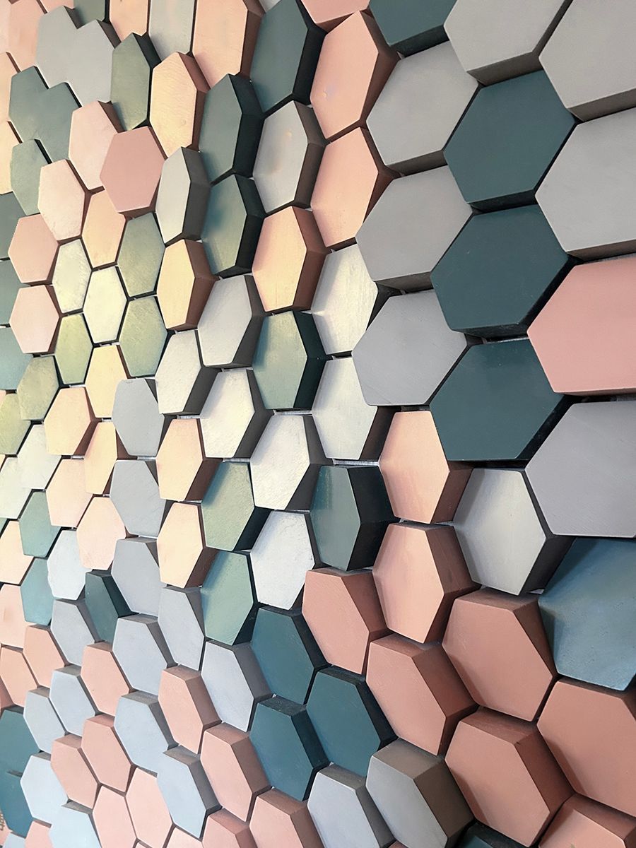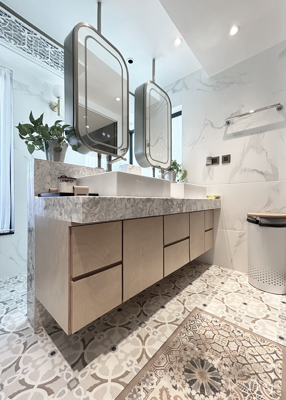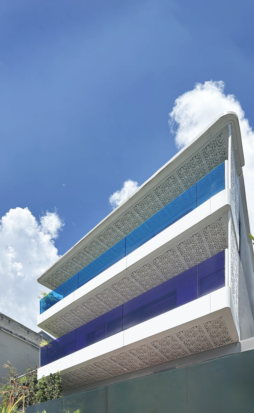 Exterior - The exterior continues the narrative of colour and memory. A custom lattice inspired by Mashrabiya patterns, referencing the client’s time in Dubai, provides both shading and identity. The façade is stratified into three tonal bands that grow lighter as they rise, visually lifting the mass and dematerializing its presence.