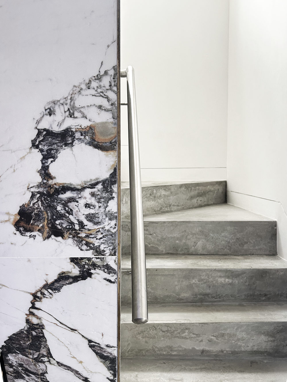 The top level—typical of Hong Kong village houses—receives the most daylight. The client requested coloured glass to introduce contrast within a largely monochrome interior. Gradating blues and yellows were selected, and where they overlap, green appears—light transformed into material through colour and orientation.